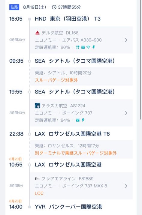 僕の目に留まったのは往復13万の正に格安航空券。とりあえずキャンセルできない事を承知の上申し込み。形容し難い高揚感とスキーナがグッと近づいた様に思えて浮き足だっていました。しかしよくみたら37時間…?え?8時間くらいじゃないの?どうやら経由便且つ持ち込み荷物が少ないので安い価格みたいです。成田→シアトル→ロサンゼルス待機12時間→バンクーバー。僕はどうやら天国へのチケットでは無く、地獄行きを買ってしまったみたいです。