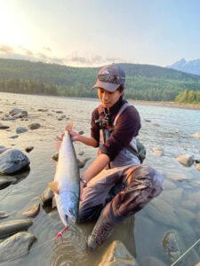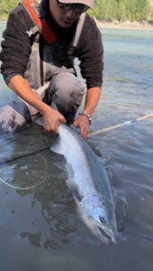 スイングを開始するとググッと抑え込むようなバイト。その後リールが逆転します。この引き。。。ピンクではないことは確か。ひょっとしてスチール?ガイドのジェイミーもスチールかもしれないと。期待が高まりますが上がってきたのはコーホ。銀鮭です。カナダ新魚種であり、人生初魚種。スチールではなかったですが全種族のマスを釣りたい僕にとってとても嬉しい出会いでした。この後このサカナへの思い入れが強くなることはこの時はまだ知りません。